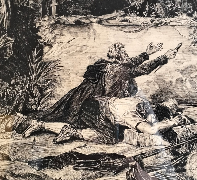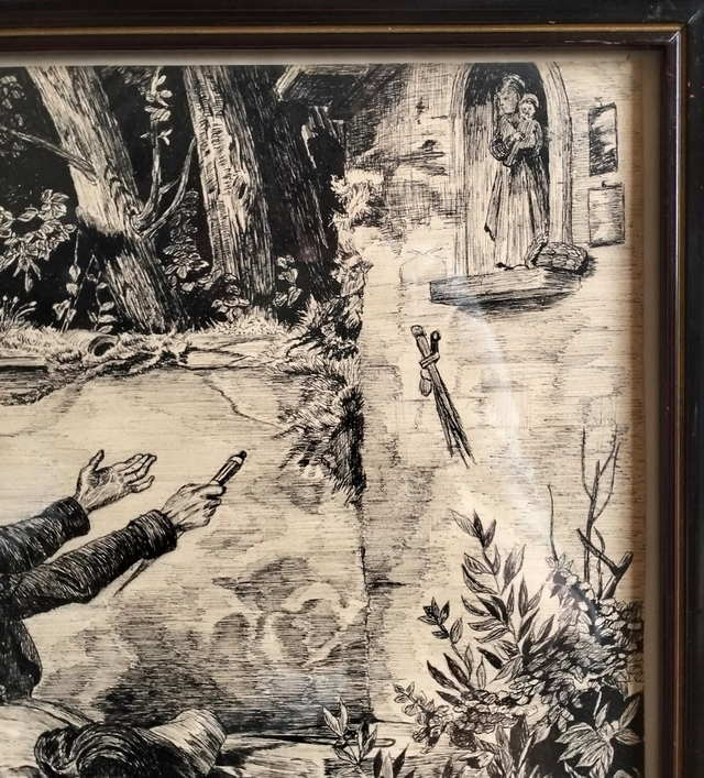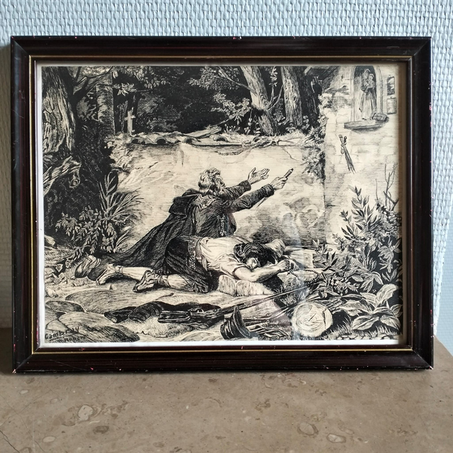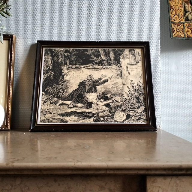 Belle illustration vintage d'une scène dramatique en forêt, très détaillée dans le style des gravures du XIXème siècle. Signée dans la planche "Cambray / Robert". Beau travail de hachures et de contrastes. Cadre en bois sombre avec un élégant liseré doré sous verre.