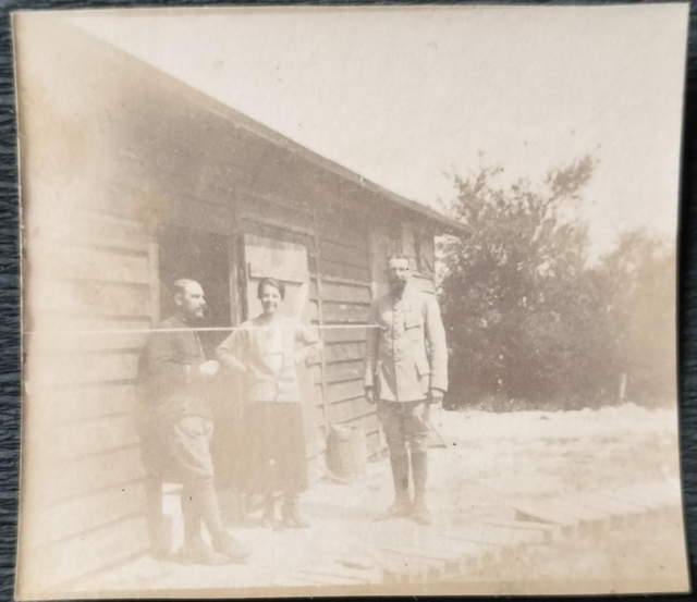 Scène rare montrant deux militaires et une femme devant un baraquement en bois.